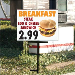 The most important sign of economic recovery: companies offering breakfast sandwiches for $2.99 again. Help clients get the word out about this all-important news by using signage and Heavy Duty Coro Stakes from National Banner. I really need to stop writing these before breakfast.